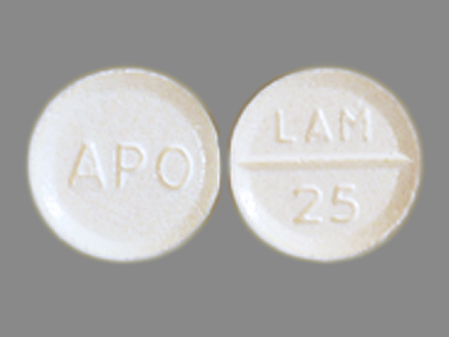 This medication is a White Round 5 mm, Tablet with imprint "LAM;25;APO". It contains Lamotrigine 25 mg; of Lamotrigine[lamotrigine];. This belongs to the Mood stabilizer pharmacologic class. It is manufactured by Apotex Corp. For details please contact your physician.