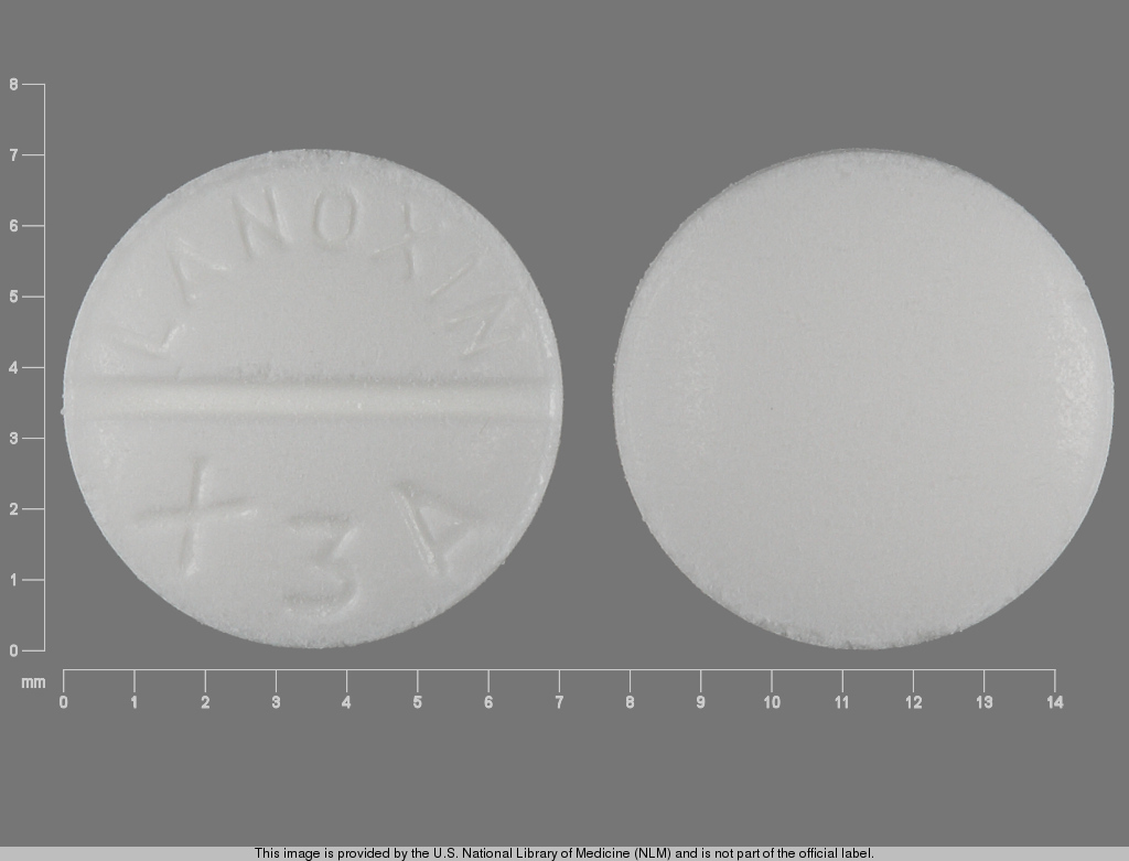 This medication is a White Round 7 mm, Tablet with imprint "LANOXIN;X3A". It contains Digoxin 250 ug; of Digoxin[digoxin];. This belongs to the Cardiac glycoside pharmacologic class. It is manufactured by GlaxoSmithKline LLC. For details please contact your physician.