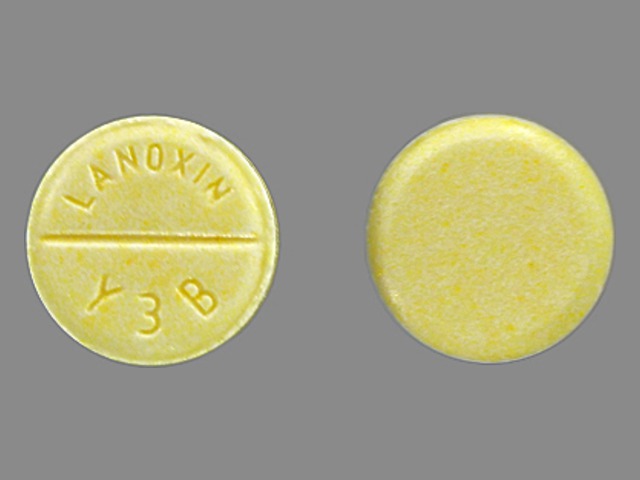 This medication is a Yellow Round 6 mm, Tablet with imprint "LANOXIN;Y3B". It contains Digoxin 0.125 mg; of Digoxin[digoxin];. This belongs to the Cardiac glycoside pharmacologic class. It is manufactured by Covis Pharmaceuticals, Inc.. For details please contact your physician.
