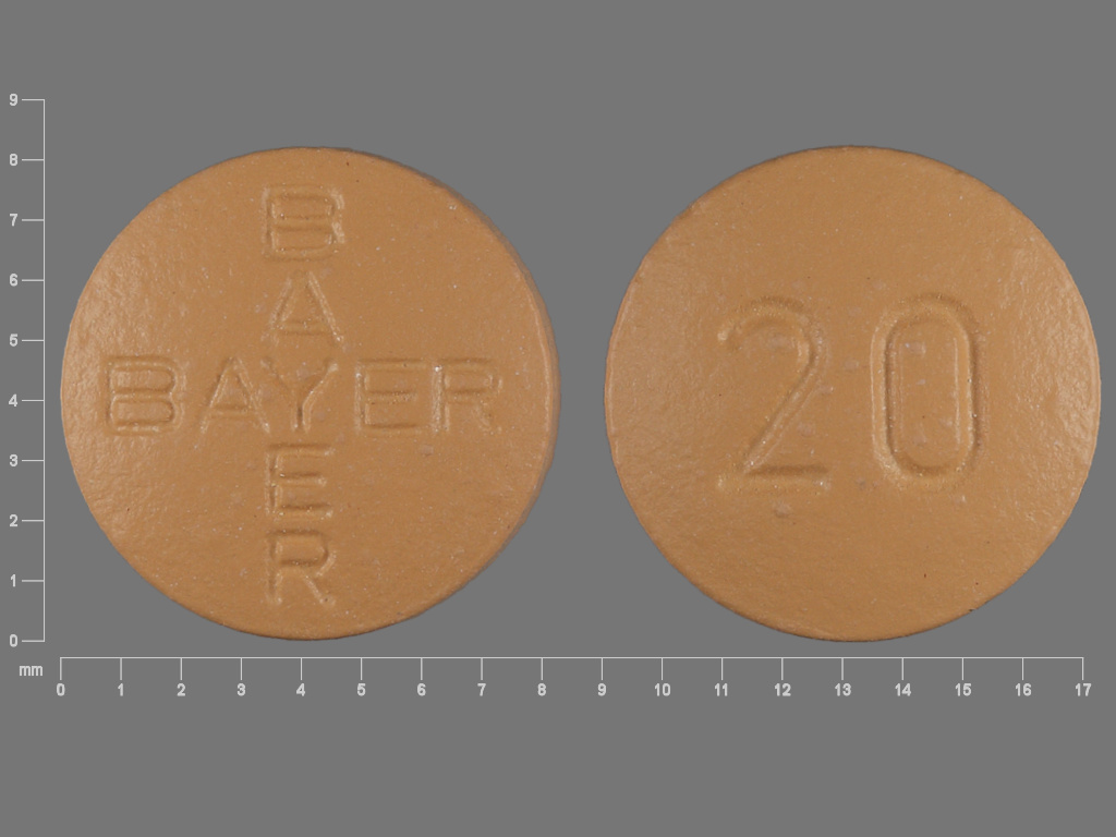 This medication is an Orange Round 8 mm, Film coated tablet with imprint "BAYER;20". It contains Vardenafil hydrochloride 20 mg; of Vardenafil hydrochloride[vardenafil];. This belongs to the Phosphodiesterase 5 inhibitor pharmacologic class. It is manufactured by GlaxoSmithKline LLC. For details please contact your physician.