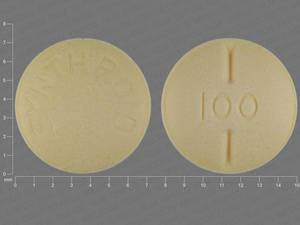 This medication is a Yellow Round 7 mm, Tablet with imprint "SYNTHROID;100". It contains 0.1 mg of Levothyroxine sodium 100 ug. It is manufactured by Abbott Laboratories. For details please contact your physician.