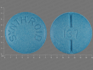 This medication is a Blue Round 7 mm, Tablet with imprint "SYNTHROID;137". It contains 0.137 mg of Levothyroxine sodium 137 ug. It is manufactured by Abbott Laboratories. For details please contact your physician.
