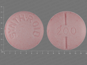 This medication is a Pink Round 7 mm, Tablet with imprint "SYNTHROID;200". It contains 0.2 mg of Levothyroxine sodium 200 ug. It is manufactured by Abbott Laboratories. For details please contact your physician.