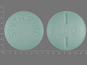 This medication is a Green Round 7 mm, Tablet with imprint "SYNTHROID;300". It contains 0.3 mg of Levothyroxine sodium 300 ug. It is manufactured by Abbott Laboratories. For details please contact your physician.