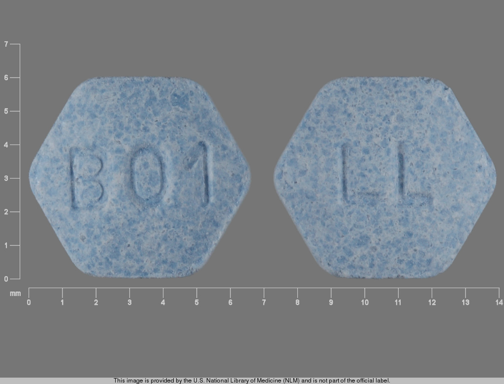 This medication is a Blue Hexagon (6 sided) 7 mm, Tablet with imprint "LL;B01". It contains Hydrochlorothiazide 12.5 mg;lisinopril 10 mg; of Hydrochlorothiazide[hydrochlorothiazide];lisinopril[lisinopril anhydrous];. It is manufactured by Lupin Pharmaceuticals, Inc.. For details please contact your physician.