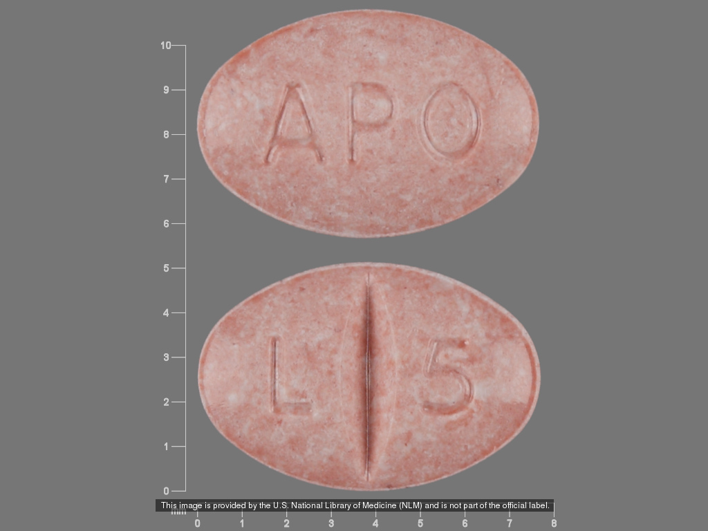 This medication is a Red Oval 8 mm, Tablet with imprint "APO;L;5". It contains Lisinopril 5 mg; of Lisinopril[lisinopril anhydrous];. This belongs to the Angiotensin converting enzyme inhibitor pharmacologic class. It is manufactured by Apotex Corp.. For details please contact your physician.