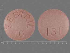 This medication is a Pink Round 8 mm, Tablet with imprint "ZESTRIL;10;131". It contains 10 mg of Lisinopril 10 mg. It is manufactured by AstraZeneca Pharmaceuticals LP. For details please contact your physician.