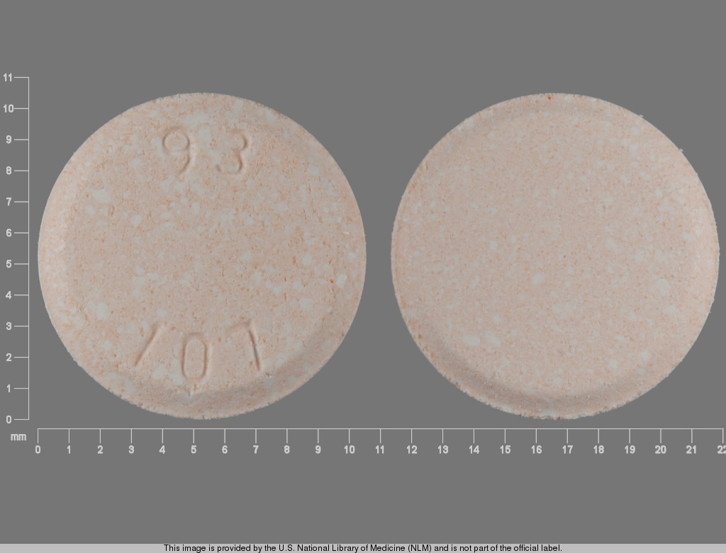 This medication is an Orange Round 10 mm, Chewable tablet with imprint "93;107". It contains Mebendazole 100 mg of Mebendazole[mebendazole]. This belongs to the Anthelmintic pharmacologic class. It is manufactured by Teva Pharmaceuticals USA Inc. For details please contact your physician.