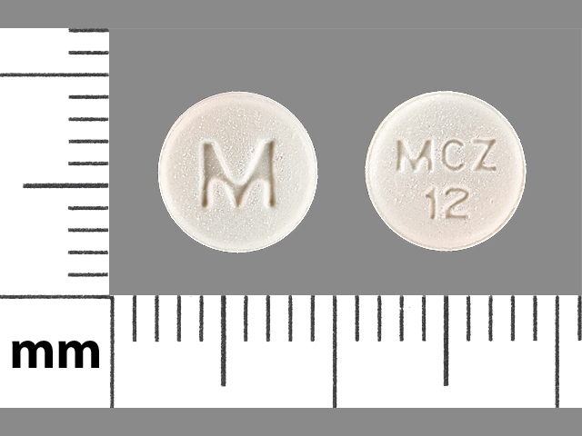 This medication is a White Round 7 mm, Tablet with imprint "M;MCZ;12". It contains Meclizine hydrochloride 12.5 mg; of Meclizine hydrochloride[meclizine];. This belongs to the Antiemetic pharmacologic class. It is manufactured by Mylan Pharmaceuticals Inc.. For details please contact your physician.