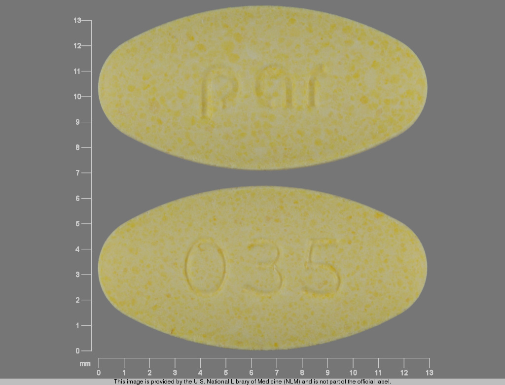 This medication is a Yellow Oval 6 mm, Tablet with imprint "Par;035". It contains Meclizine hydrochloride 25 mg; of Meclizine hydrochloride[meclizine];. This belongs to the Antiemetic pharmacologic class. It is manufactured by Par Pharmaceutical, Inc.. For details please contact your physician.