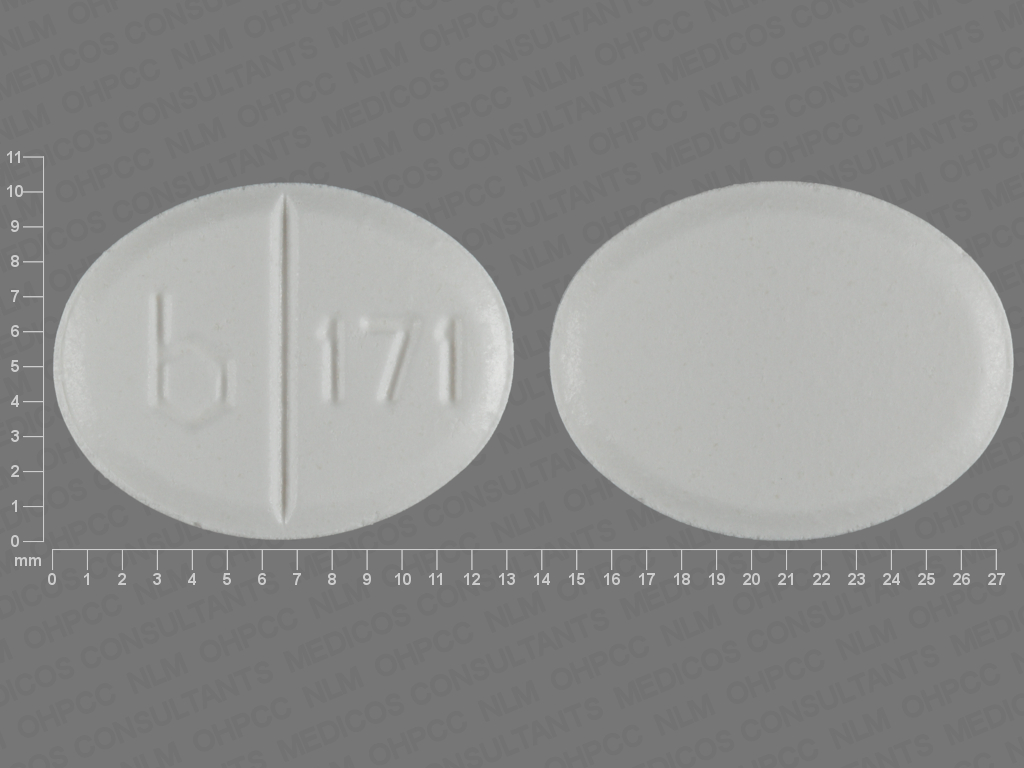 This medication is a White Oval 13 mm, Tablet with imprint "b;171". It contains Mefloquine hydrochloride 250 mg; of Mefloquine hydrochloride[mefloquine];. This belongs to the Antimalarial pharmacologic class. It is manufactured by Teva Pharmaceuticals USA, Inc.. For details please contact your physician.