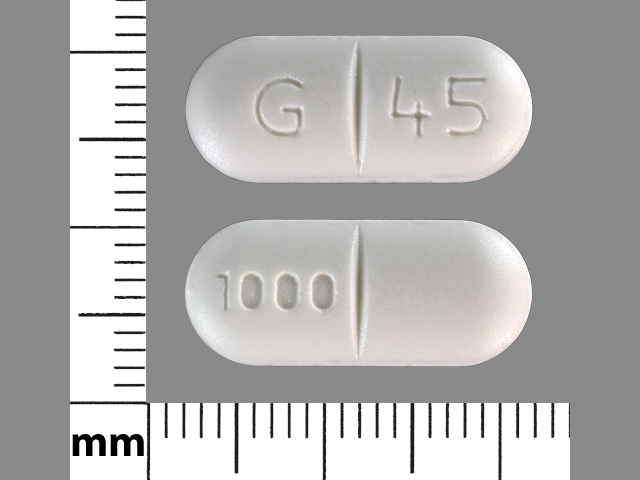 This medication is a White Round 20 mm, Tablet with imprint "G;45;1000". It contains Metformin hydrochloride 1000 mg; of Metformin hydrochloride[metformin];. This belongs to the Biguanide pharmacologic class. It is manufactured by Blu Pharmaceuticals, LLC. For details please contact your physician.