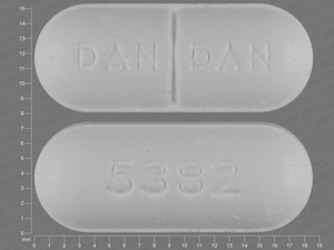 This medication is a White Oval 18 mm, Tablet with imprint "DAN;DAN;5382". It contains 750 mg of Methocarbamol 750 mg. It is manufactured by Watson Laboratories, Inc.. For details please contact your physician.