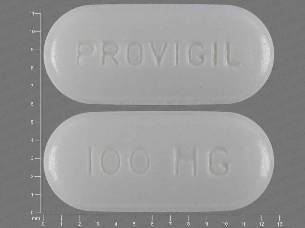 This medication is a White Oval 13 mm, Tablet with imprint "PROVIGIL;100;MG". It contains Modafinil 100 mg; of Modafinil[modafinil];. This belongs to the Sympathomimetic-like agent pharmacologic class. It is manufactured by CIMA LABS INC.. For details please contact your physician.