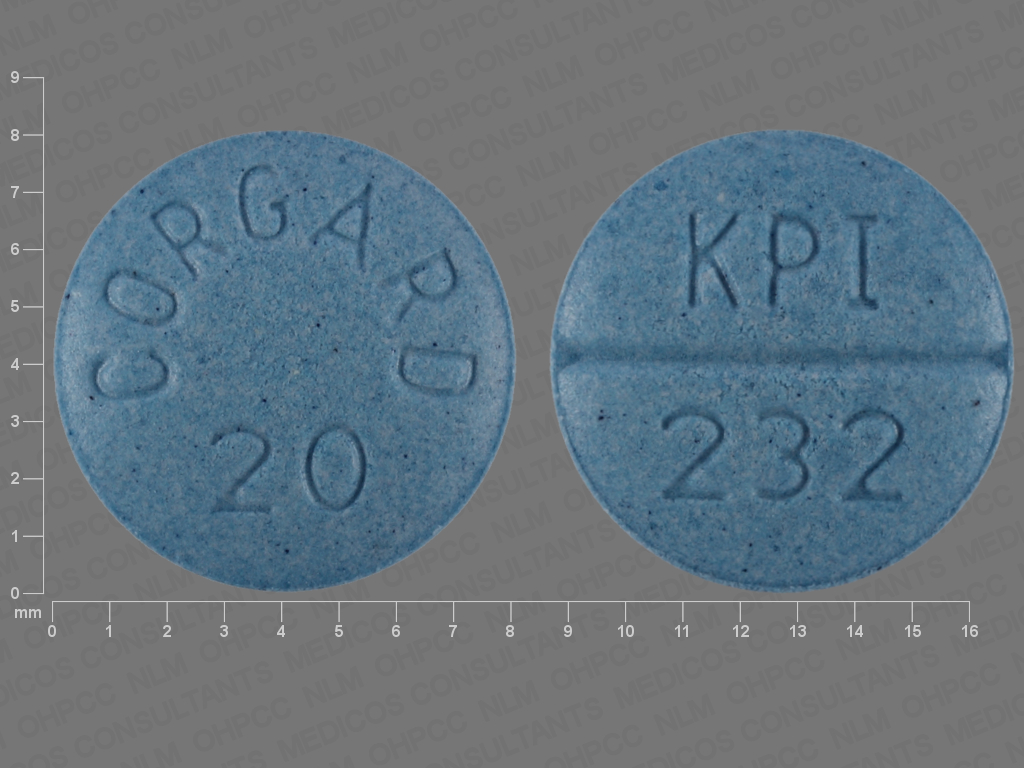 This medication is a Blue Round 8 mm, Tablet with imprint "KPI;232;Corgard;20". It contains Nadolol 20 mg; of Nadolol[nadolol];. This belongs to the Beta-adrenergic blocker pharmacologic class. It is manufactured by Greenstone LLC. For details please contact your physician.