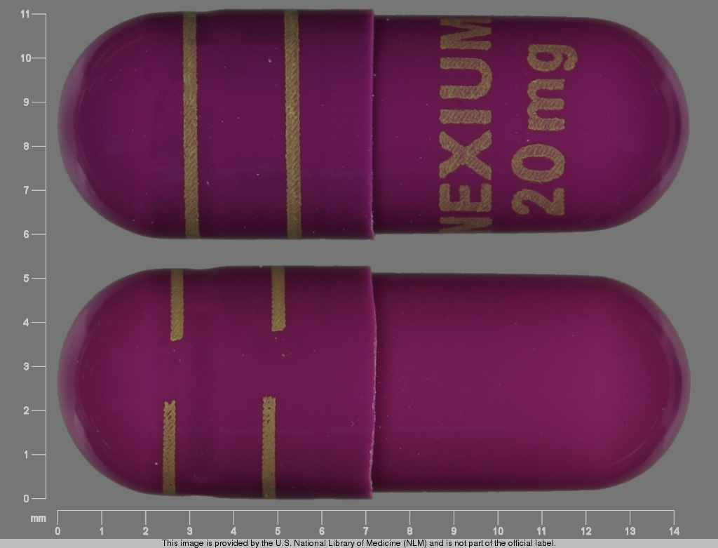 This medication is a Purple Capsule 14 mm, Delayed release capsule with imprint "NEXIUM20mg". It contains Esomeprazole magnesium 20 mg; of Esomeprazole magnesium[esomeprazole];. This belongs to the Proton pump inhibitor pharmacologic class. It is manufactured by AstraZeneca Pharmaceuticals LP. For details please contact your physician.