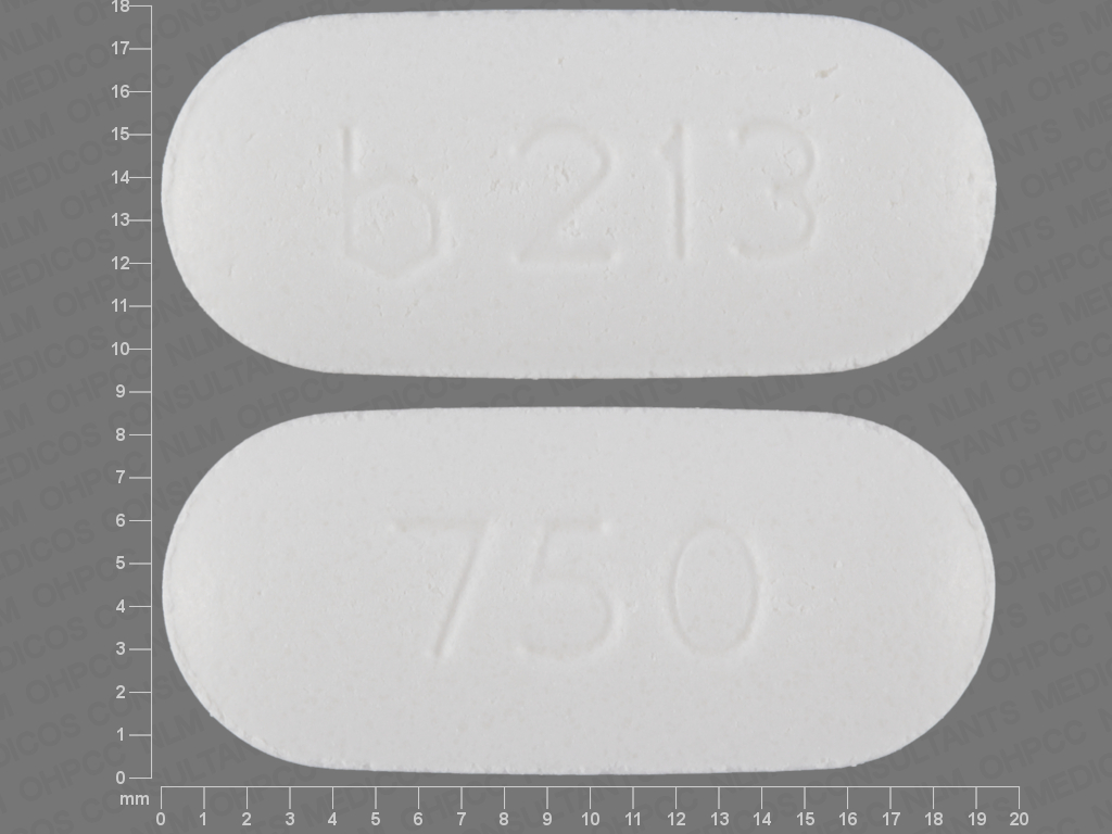 This medication is a White Oval 19 mm, Extended release tablet with imprint "b;213;750". It is manufactured by Teva Pharmaceuticals USA Inc. For details please contact your physician.