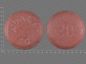 This medication is a Pink Round 9 mm, Extended release tablet with imprint "30;ADALAT;CC". It contains 30 mg of Nifedipine 30 mg. It is manufactured by Bayer HealthCare Pharmaceuticals Inc.. For details please contact your physician.
