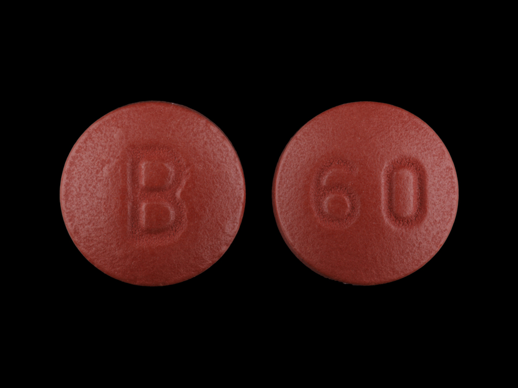 This medication is a Red Round 9 mm, Film coated extended release tablet with imprint "B;60". It contains Nifedipine 60 mg; of Nifedipine[nifedipine];. This belongs to the Dihydropyridine calcium channel blocker pharmacologic class. It is manufactured by Teva Pharmaceuticals USA Inc. For details please contact your physician.