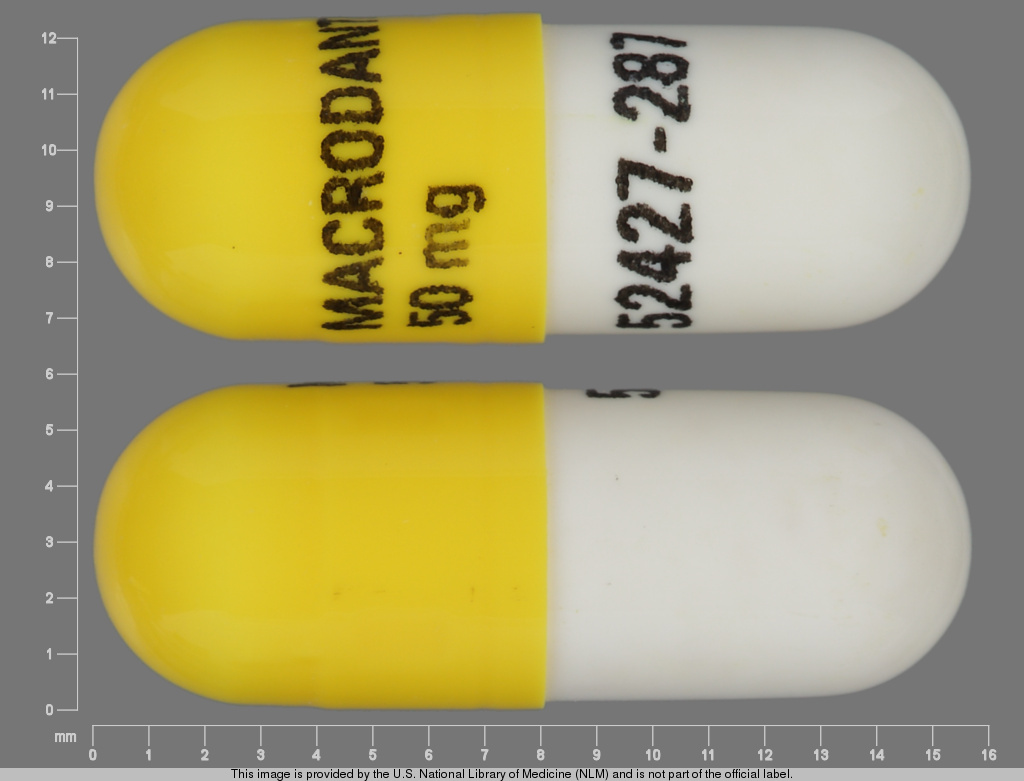 This medication is a Yellow;white Capsule 14 mm, Capsule with imprint "MACRODANTIN;50;mg;52427;287". It contains Nitrofurantoin 50 mg; of Nitrofurantoin[nitrofurantoin];. This belongs to the Nitrofuran antibacterial pharmacologic class. It is manufactured by Alvogen Inc.. For details please contact your physician.