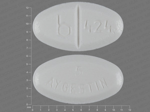This medication is a White Oval 11 mm, Tablet with imprint "5;AYGESTIN;b;424". It contains 5 mg of Norethindrone acetate 5 mg. It is manufactured by Teva Women's Health, Inc.. For details please contact your physician.