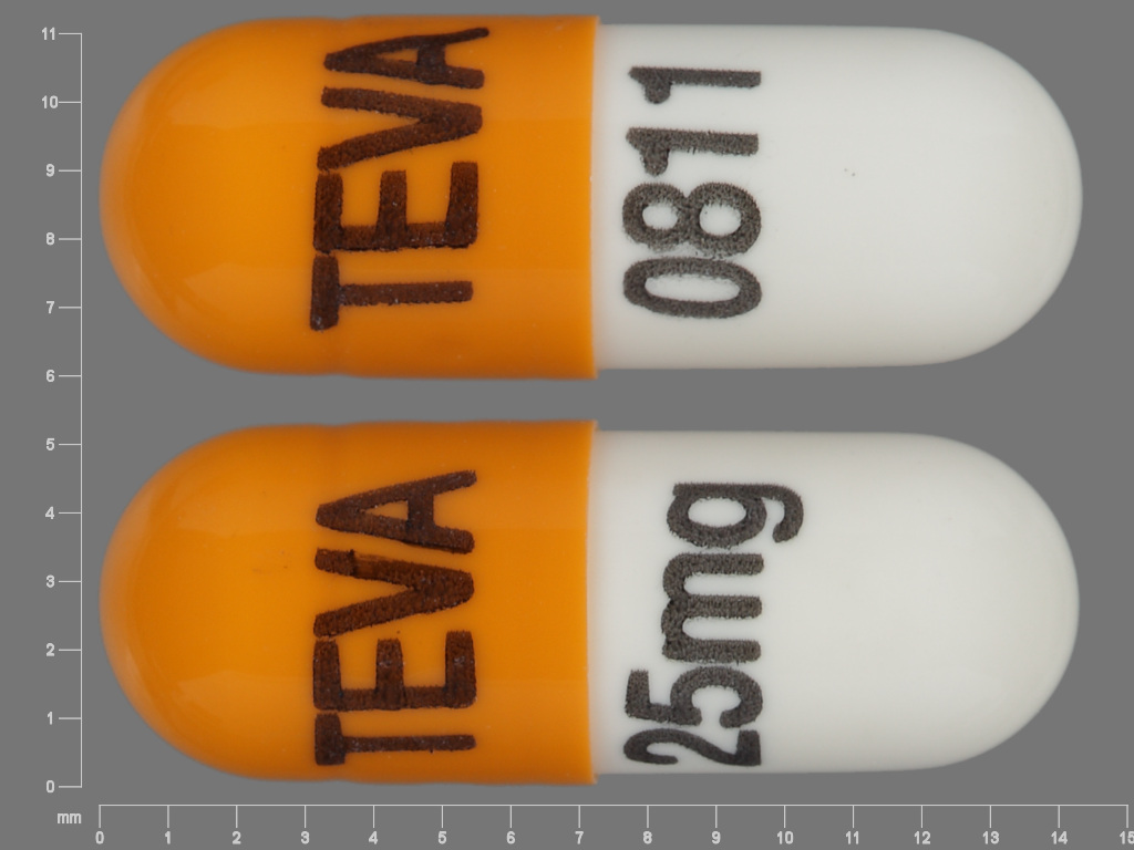 This medication is a White;orange Capsule 14 mm, Capsule with imprint "TEVA;TEVA;25mg;0811". It contains Nortriptyline hydrochloride 25 mg; of Nortriptyline hydrochloride[nortriptyline];. This belongs to the Tricyclic antidepressant pharmacologic class. It is manufactured by Teva Pharmaceuticals USA, Inc.. For details please contact your physician.