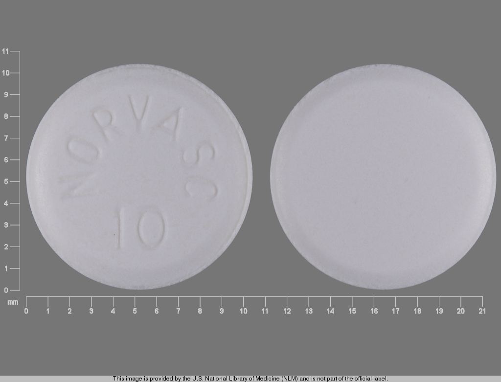 This medication is a White Round 10 mm, Tablet with imprint "NORVASC;10". It contains Amlodipine besylate 10 mg; of Amlodipine besylate[amlodipine];. This belongs to the Dihydropyridine calcium channel blocker pharmacologic class. It is manufactured by Pfizer Laboratories Div Pfizer Inc. For details please contact your physician.