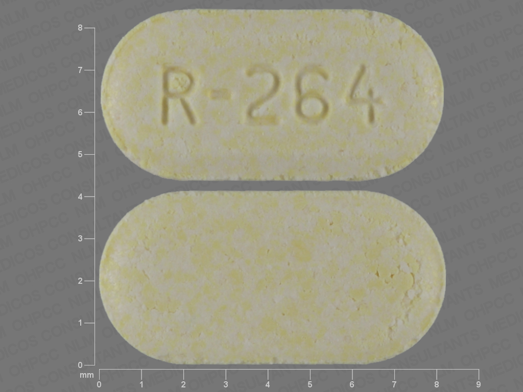 This medication is a Yellow Oval 8 mm, Unknown with imprint "R;264". It is manufactured by Dr.Reddys Laboratories Limited. For details please contact your physician.
