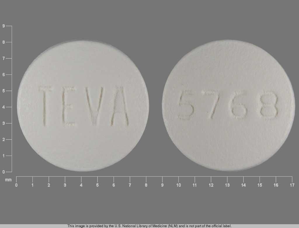 This medication is a White Round 8 mm, Film coated tablet with imprint "TEVA;5768". It contains Olanzapine 5 mg; of Olanzapine[olanzapine];. This belongs to the Atypical antipsychotic pharmacologic class. It is manufactured by Teva Pharmaceuticals USA, Inc.. For details please contact your physician.