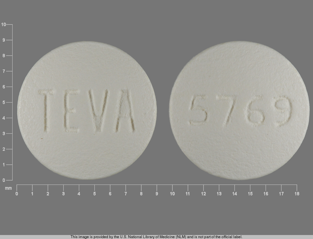 This medication is a White Round 9 mm, Film coated tablet with imprint "TEVA;5769". It contains Olanzapine 7.5 mg; of Olanzapine[olanzapine];. This belongs to the Atypical antipsychotic pharmacologic class. It is manufactured by Teva Pharmaceuticals USA, Inc.. For details please contact your physician.