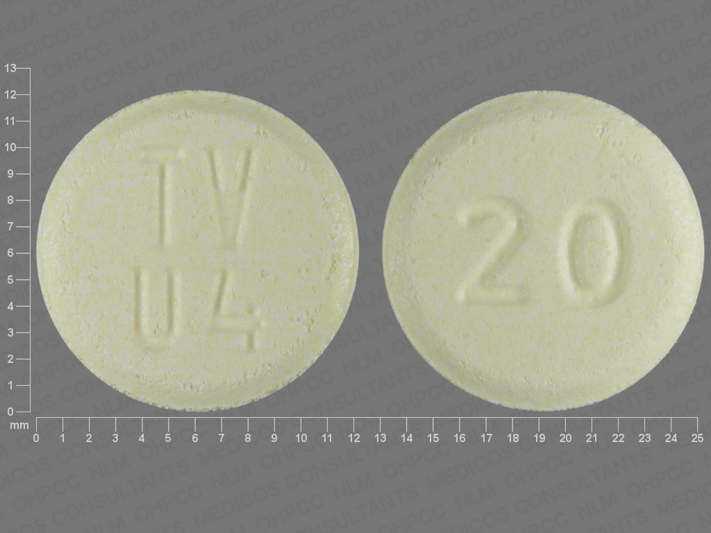 This medication is a Yellow Round 12 mm, Orally disintegrating tablet with imprint "TV;U4;20". It contains Olanzapine 20 mg; of Olanzapine[olanzapine];. This belongs to the Atypical antipsychotic pharmacologic class. It is manufactured by Teva Pharmaceuticals USA, Inc.. For details please contact your physician.
