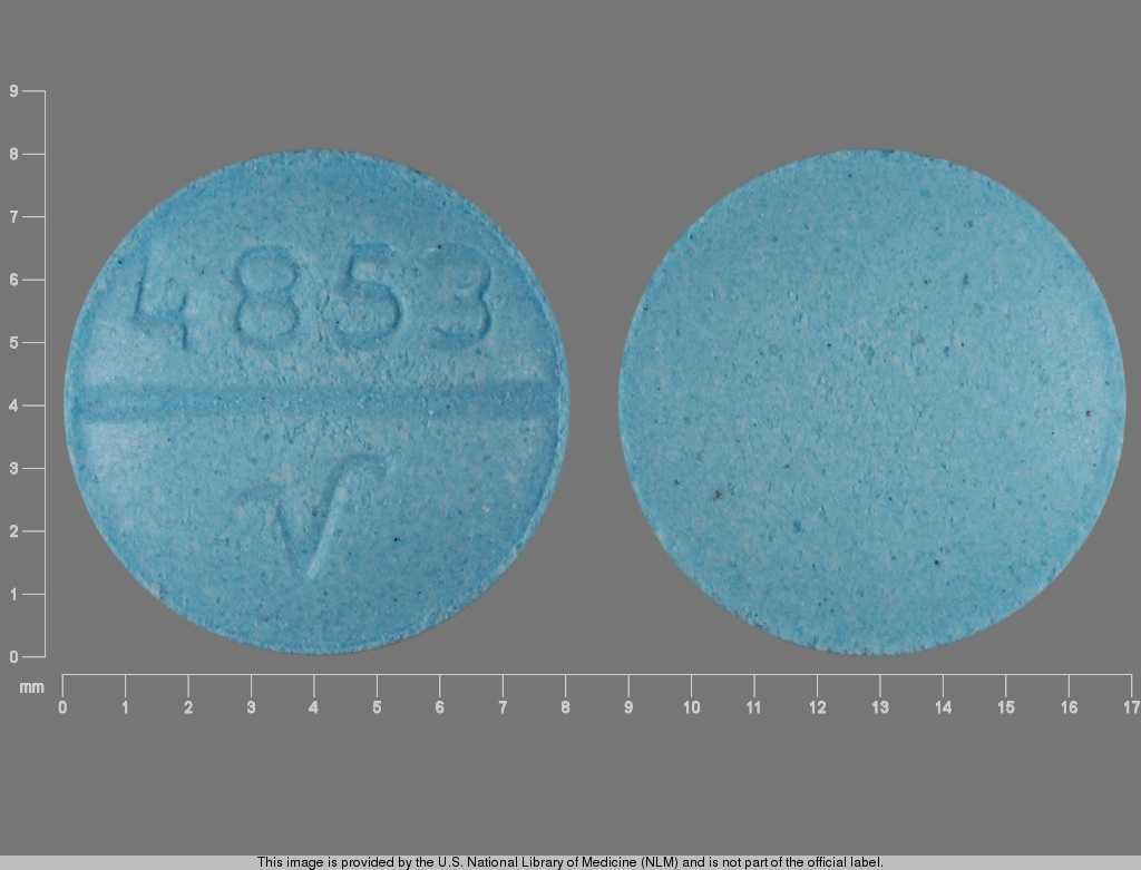 This medication is a Blue Round 8 mm, Tablet with imprint "4853;V". It contains Oxybutynin chloride 5 mg; of Oxybutynin chloride[oxybutynin];. This belongs to the Cholinergic muscarinic antagonist pharmacologic class. It is manufactured by Par Pharmaceutical. For details please contact your physician.