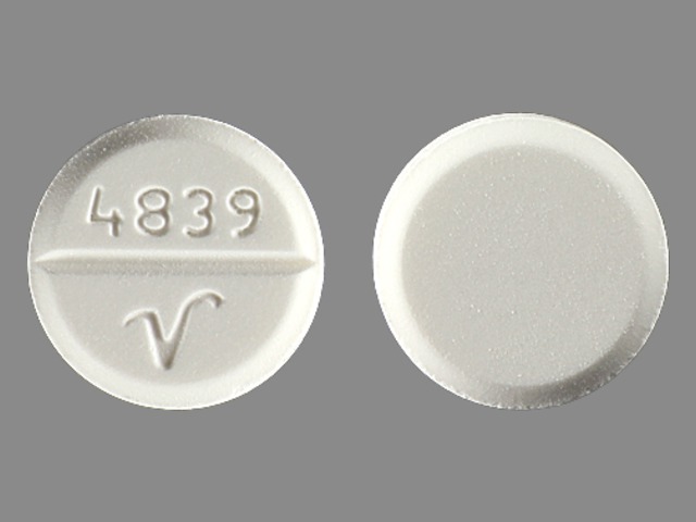This medication is a White Round 12 mm, Tablet with imprint "4839;V". It contains Oxycodone hydrochloride 5 mg;acetaminophen 325 mg; of Oxycodone hydrochloride[oxycodone];acetaminophen[acetaminophen];. It is manufactured by Par Pharmaceutical. For details please contact your physician.