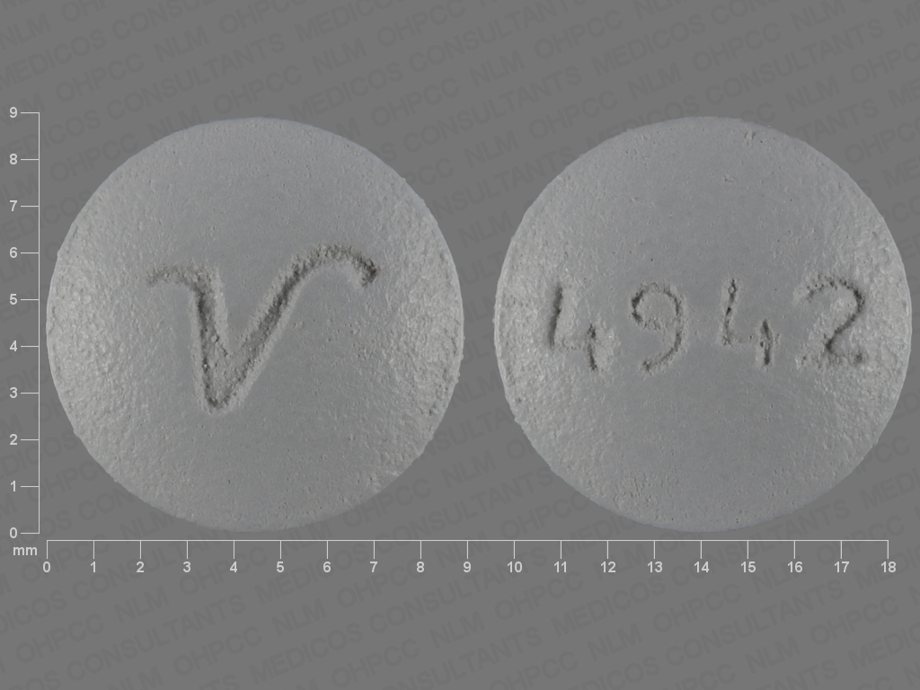 This medication is a Gray Round 9 mm, Film coated tablet with imprint "4942;V". It contains Perphenazine 8 mg; of Perphenazine[perphenazine];. This belongs to the Phenothiazine pharmacologic class. It is manufactured by American Health Packaging. For details please contact your physician.