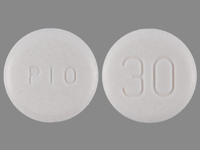 This medication is a White Round 7 mm, Tablet with imprint "PIO;30". It contains Pioglitazone hydrochloride 30 mg; of Pioglitazone hydrochloride[pioglitazone];. This belongs to the Peroxisome proliferator receptor alpha agonist pharmacologic class. It is manufactured by Accord Healthcare, Inc.. For details please contact your physician.