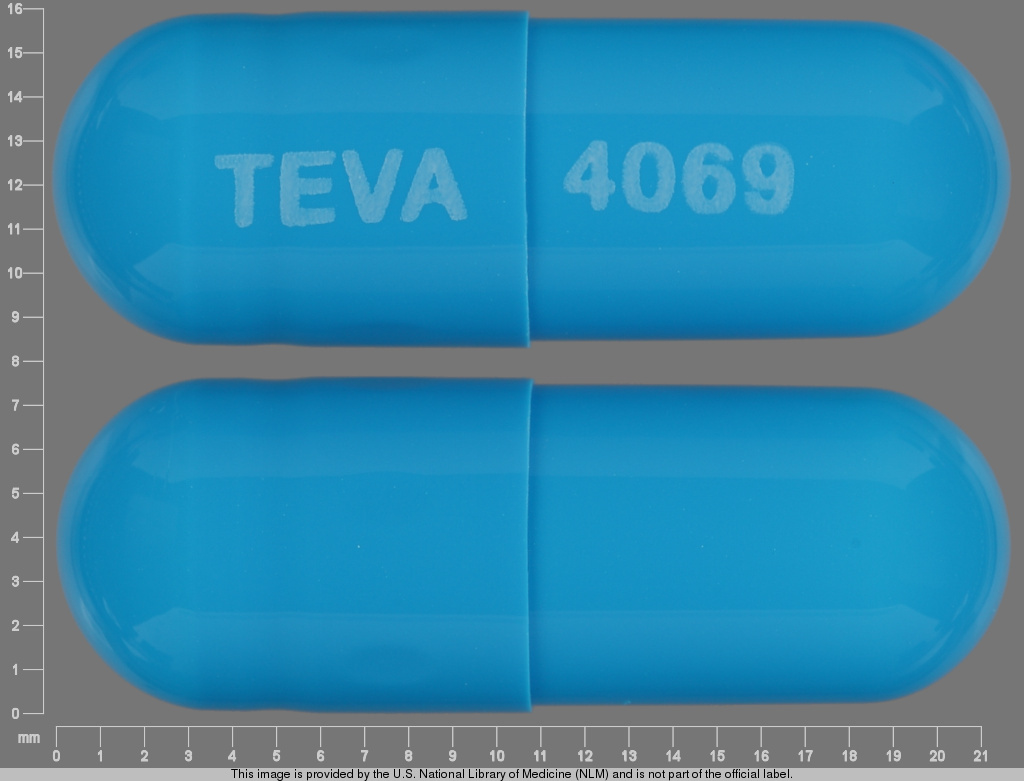 This medication is a Blue Capsule 22 mm, Capsule with imprint "TEVA;4069". It contains Prazosin hydrochloride 5 mg; of Prazosin hydrochloride[prazosin];. This belongs to the Alpha-adrenergic blocker pharmacologic class. It is manufactured by Teva Pharmaceuticals USA, Inc.. For details please contact your physician.