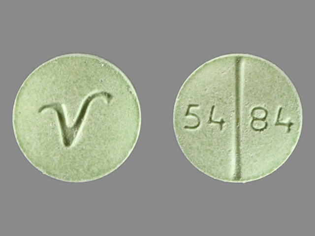 This medication is a Green Round 9 mm, Tablet with imprint "54;84;V". It contains Propranolol hydrochloride 40 mg; of Propranolol hydrochloride[propranolol];. This belongs to the Beta-adrenergic blocker pharmacologic class. It is manufactured by Par Pharmaceutical. For details please contact your physician.