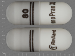 This medication is a Gray, white Capsule 16 mm, Extended release capsule with imprint "80;InnoPran;XL;Reliant". It contains 80 mg of Propranolol hydrochloride 80 mg. It is manufactured by GlaxoSmithKline LLC. For details please contact your physician.
