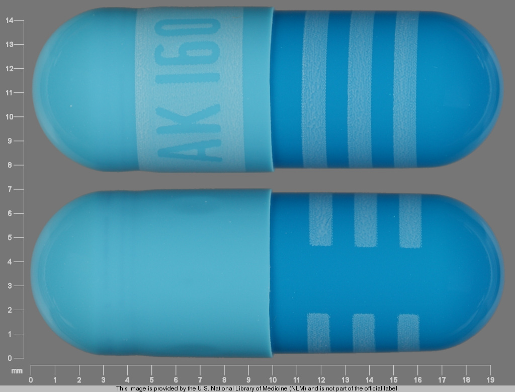 This medication is a Blue Capsule 19 mm, Extended release capsule with imprint "AK;160". It contains Propranolol hydrochloride 160 mg; of Propranolol hydrochloride[propranolol];. This belongs to the Beta-adrenergic blocker pharmacologic class. It is manufactured by Rouses Point Pharm. For details please contact your physician.