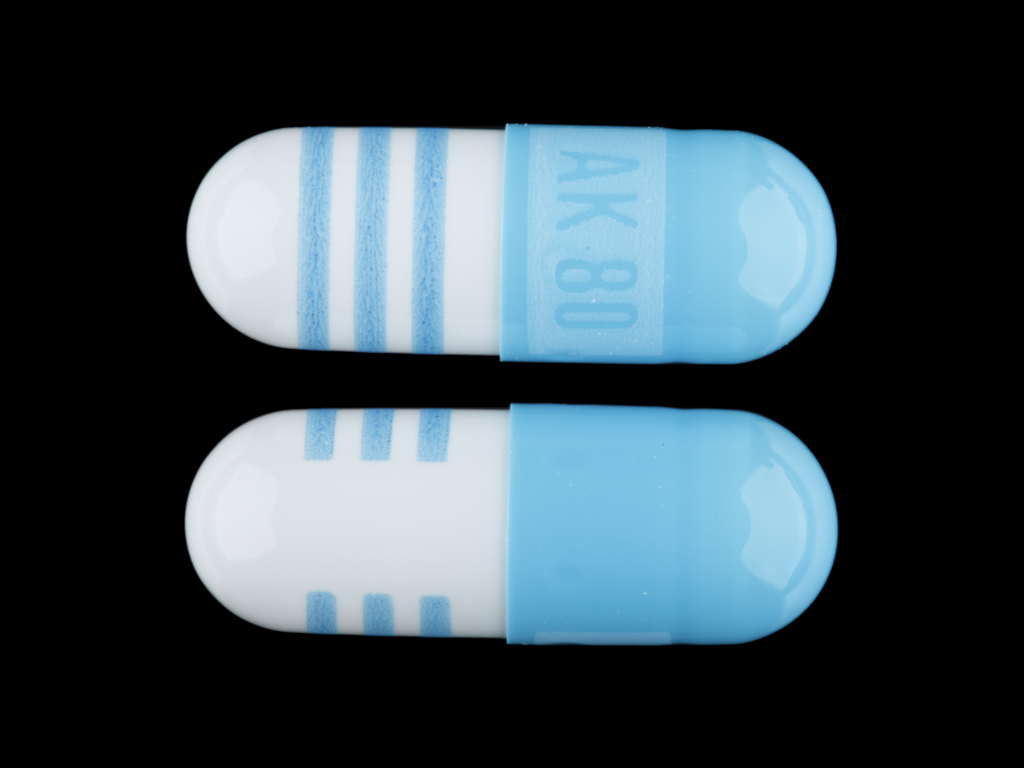 This medication is a White;blue Capsule 16 mm, Extended release capsule with imprint "AK;80". It contains Propranolol hydrochloride 80 mg; of Propranolol hydrochloride[propranolol];. This belongs to the Beta-adrenergic blocker pharmacologic class. It is manufactured by Rouses Point Pharm. For details please contact your physician.