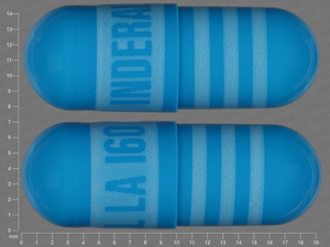 This medication is a Blue Capsule 19 mm, Extended release capsule with imprint "INDERAL;LA;160". It contains 160 mg of Propranolol hydrochloride 160 mg. It is manufactured by Akrimax Pharmaceuticals, LLC. For details please contact your physician.