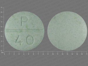 This medication is a Green Round 8 mm, Tablet with imprint "P;40". It contains 40 mg of Propranolol hydrochloride 40 mg. It is manufactured by Heritage Pharmaceuticals Inc. For details please contact your physician.