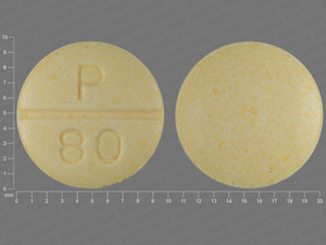 This medication is a Yellow Round 10 mm, Tablet with imprint "P;80". It contains 80 mg of Propranolol hydrochloride 80 mg. It is manufactured by Heritage Pharmaceuticals Inc. For details please contact your physician.
