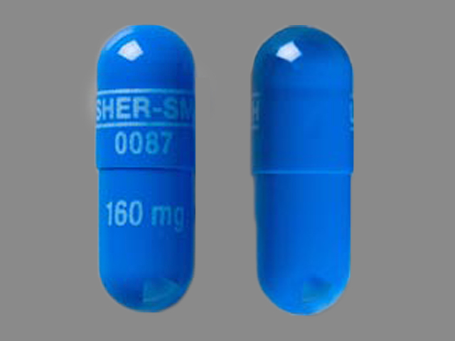 This medication is a Blue Capsule 17 mm, Extended release capsule with imprint "UPSHER;SMITH;0087;160mg". It contains Propranolol hydrochloride 160 mg; of Propranolol hydrochloride[propranolol];. This belongs to the Beta-adrenergic blocker pharmacologic class. It is manufactured by Upsher-Smith Laboratories, Inc.. For details please contact your physician.