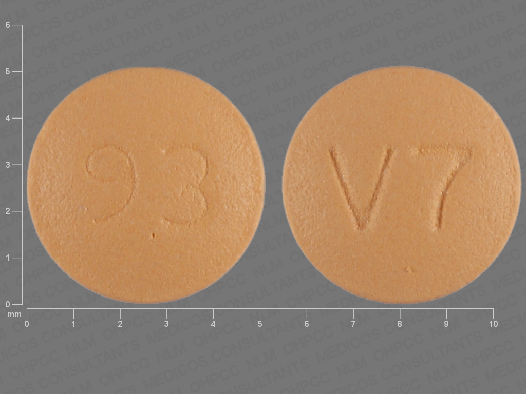 This medication is an Orange Round 5 mm, Film coated tablet with imprint "93;V7". It contains Quetiapine fumarate 25 mg; of Quetiapine fumarate[quetiapine];. This belongs to the Atypical antipsychotic pharmacologic class. It is manufactured by Teva Pharmaceuticals USA, Inc.. For details please contact your physician.