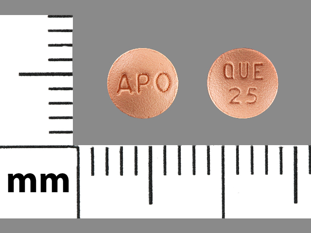 This medication is a Pink Round 5 mm, Film coated tablet with imprint "APO;QUE;25". It contains Quetiapine fumarate 25 mg; of Quetiapine fumarate[quetiapine];. This belongs to the Atypical antipsychotic pharmacologic class. It is manufactured by Apotex Corp.. For details please contact your physician.