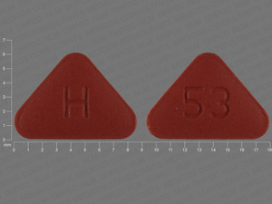 This medication is a Brown Triangle 9 mm, Tablet with imprint "53;H". It is manufactured by Aurobindo Pharma Limited. For details please contact your physician.