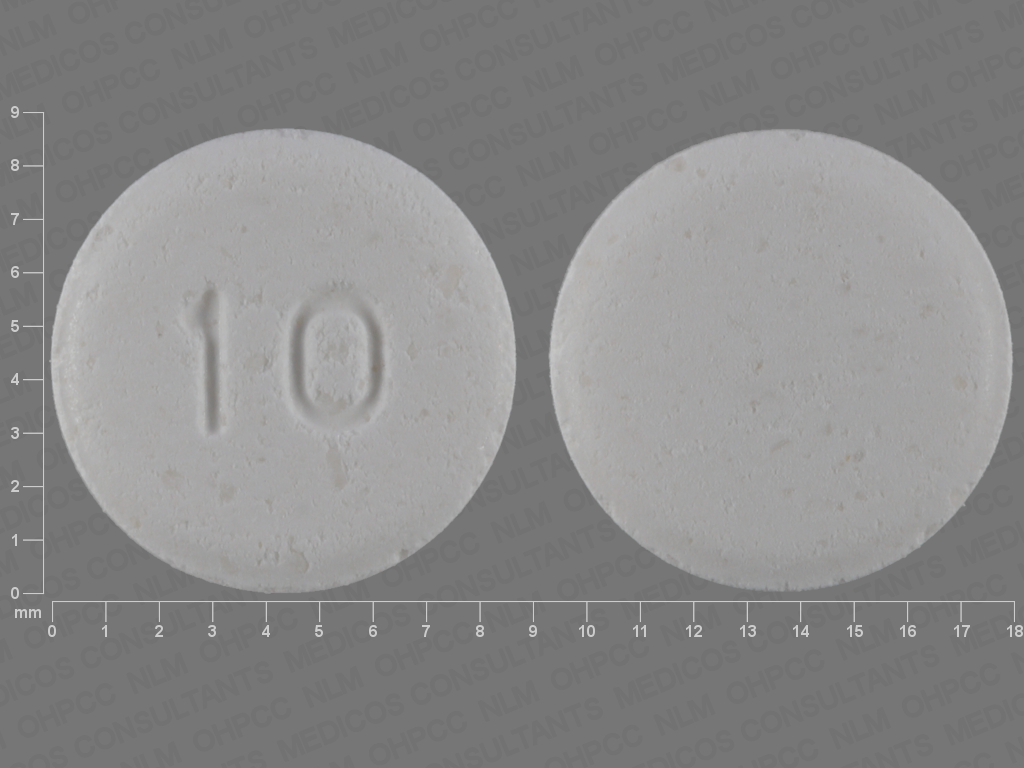 This medication is a White Round 8 mm, Orally disintegrating tablet with imprint "10". It contains Rizatriptan benzoate 10 mg; of Rizatriptan benzoate[rizatriptan];. This belongs to the Serotonin-1b and serotonin-1d receptor agonist pharmacologic class. It is manufactured by Breckenridge Pharmaceutical, Inc.. For details please contact your physician.