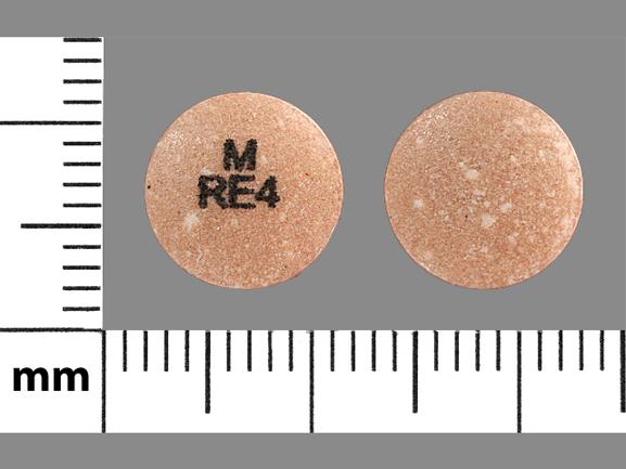 This medication is a Brown Round 10 mm, Film coated extended release tablet with imprint "M;RE4". It contains Ropinirole hydrochloride 4 mg; of Ropinirole hydrochloride[ropinirole];. This belongs to the Nonergot dopamine agonist pharmacologic class. It is manufactured by Mylan Pharmaceuticals Inc.. For details please contact your physician.
