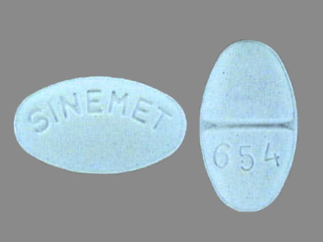 This medication is a Blue Oval 15 mm, Tablet with imprint "654;SINEMET". It contains Carbidopa 25 mg / levodopa 250 mg of Carbidopa[carbidopa] / levodopa[levodopa]. This belongs to the Aromatic amino acid decarboxylation inhibitor pharmacologic class. It is manufactured by Bristol-Myers Squibb Pharma Company. For details please contact your physician.